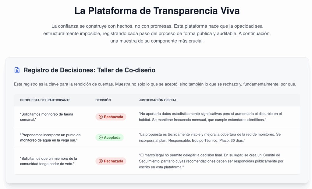 Esta herramienta no solo documenta; construye activamente la confianza. Transforma la transparencia de una declaración de valores a una práctica verificable.