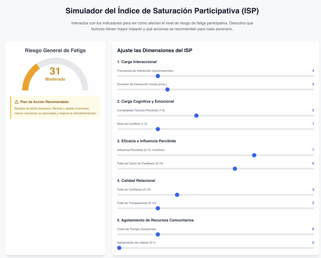 Si la bitácora es el registro de hechos, el Índice de Saturación Participativa (ISP) es el termómetro que mide el pulso de la relación. Se trata de una herramienta metodológica novedosa diseñada para cuantificar el riesgo de fatiga y desafección antes de que se vuelvan críticos. En lugar de reaccionar ante una crisis, permite anticiparla.